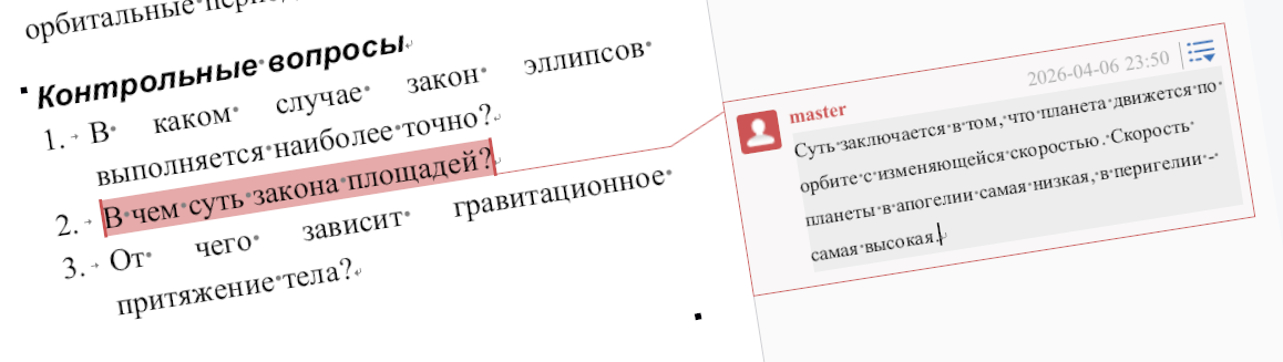 Всплывающие примечания - это один из интерактивных элементов, реализованных в оболочке Оазис-Пресс. Примечания позволяют скрыть от студента небольшой фрагмент информации и показать его только при щелчке мыши по заранее выделенному тексту или пиктограмме. Подобные интерактивные элементы удобны в качестве проверочных вопросов, позволяющих учащемуся прочитать вопрос, обдумать собственный ответ, а затем сравнить его со скрытым правильным ответом.
