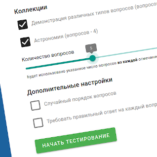 Собранное электронное издание будет содержать отдельную коллекцию вопросов для каждого загруженного XML-файла. Пользователь сможет самостоятельно выбирать коллекции, включаемые в самопроверку, регулировать количество используемых вопросов и другие опции тестирования (рис. 3).